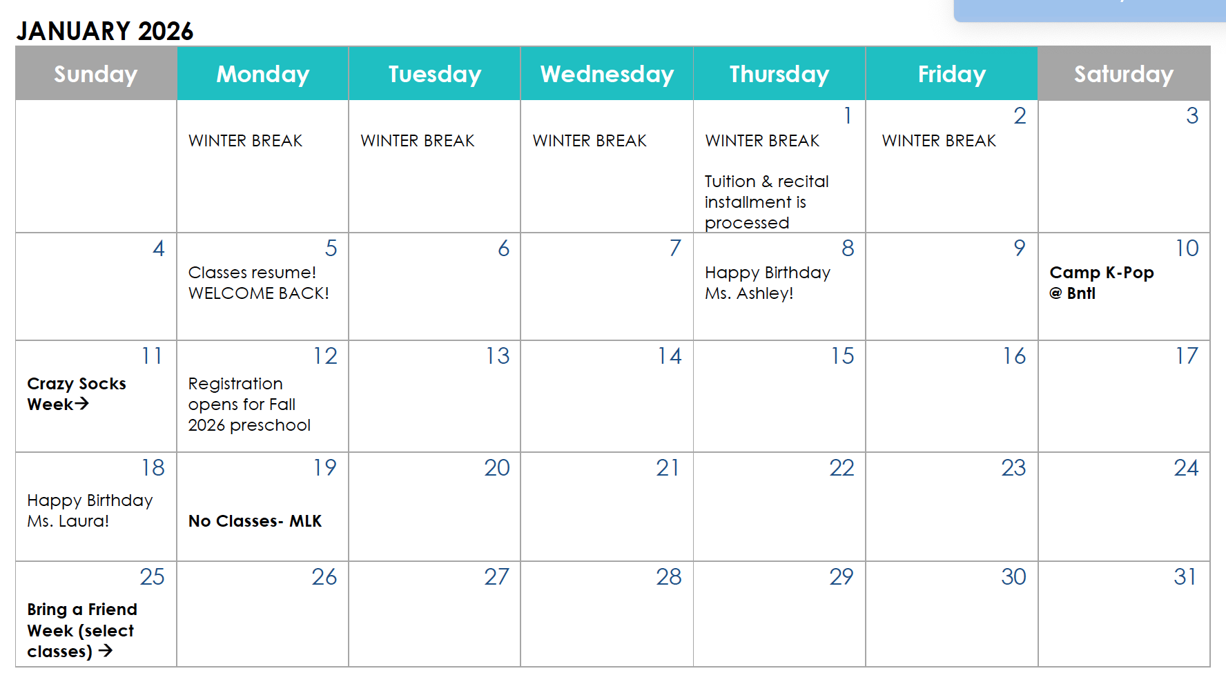 Hi families! Happy New Year! As we reflect on 2025, I am thankful for the progress we’ve made and the direction we are going. I’m proud to be able to provide a place that can contribute to our community in raising up the next generation of leaders to accomplish all they set out to do through the platform of dance and preschool.