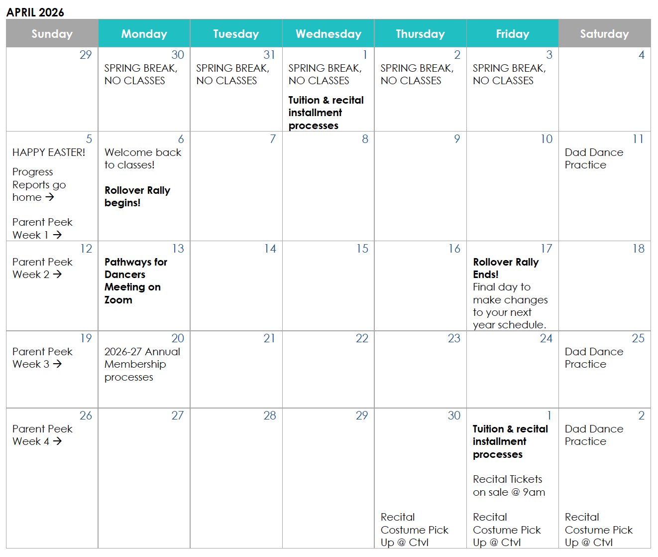 The studio will be closed for Spring Break. Enjoy your time off! Reminder: Tuition is based on the season regardless of how many weeks are in each month. Monthly tuition is calculated based off the total number of classes during the year, split into equal monthly payments.