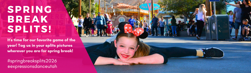 Show us your best “spring break splits” wherever you are! Tag @expressionsdanceutah in your Facebook/Instagram posts and stories and use the hashtag #springbreaksplits2026