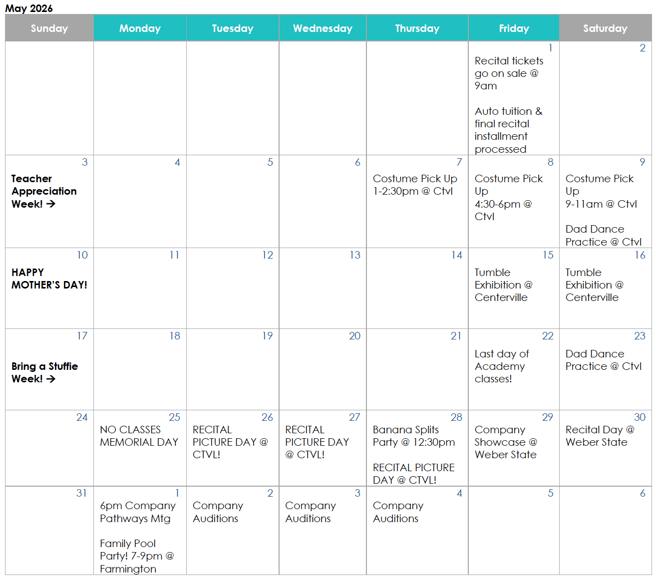 May 26-28: Picture Day & Dress Rehearsals @ Ctvl